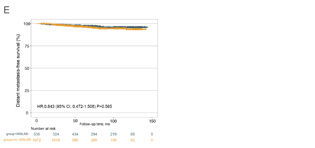 中位随访60.9个月后,IMSLNB组的5年DFS显著优于no-IMSLNB组(95.9%vs.93.9%;HR,0.562;95%CI:0.364–0.869;P=0.010),但5年OS差异无统计学意义(98.9%vs.98.5%;HR,0.487;95%CI:0.208–1.141;P=0.098)。IMSLNB组的5年RRFS(99.4%vs 98.4%,HR,0.360;95%CI:0.145-0.890;P=0.027)和LRFS(99.6%vs 98.5%,HR,0.380;95%CI:0.118-0.800;P=0.016)均显著优于no-IMSLNB组,但两组间的5年DMFS差异无统计学意义(96.8%vs 97.0%,HR,0.843;95%CI:0.472-1.508;P=0.565)。