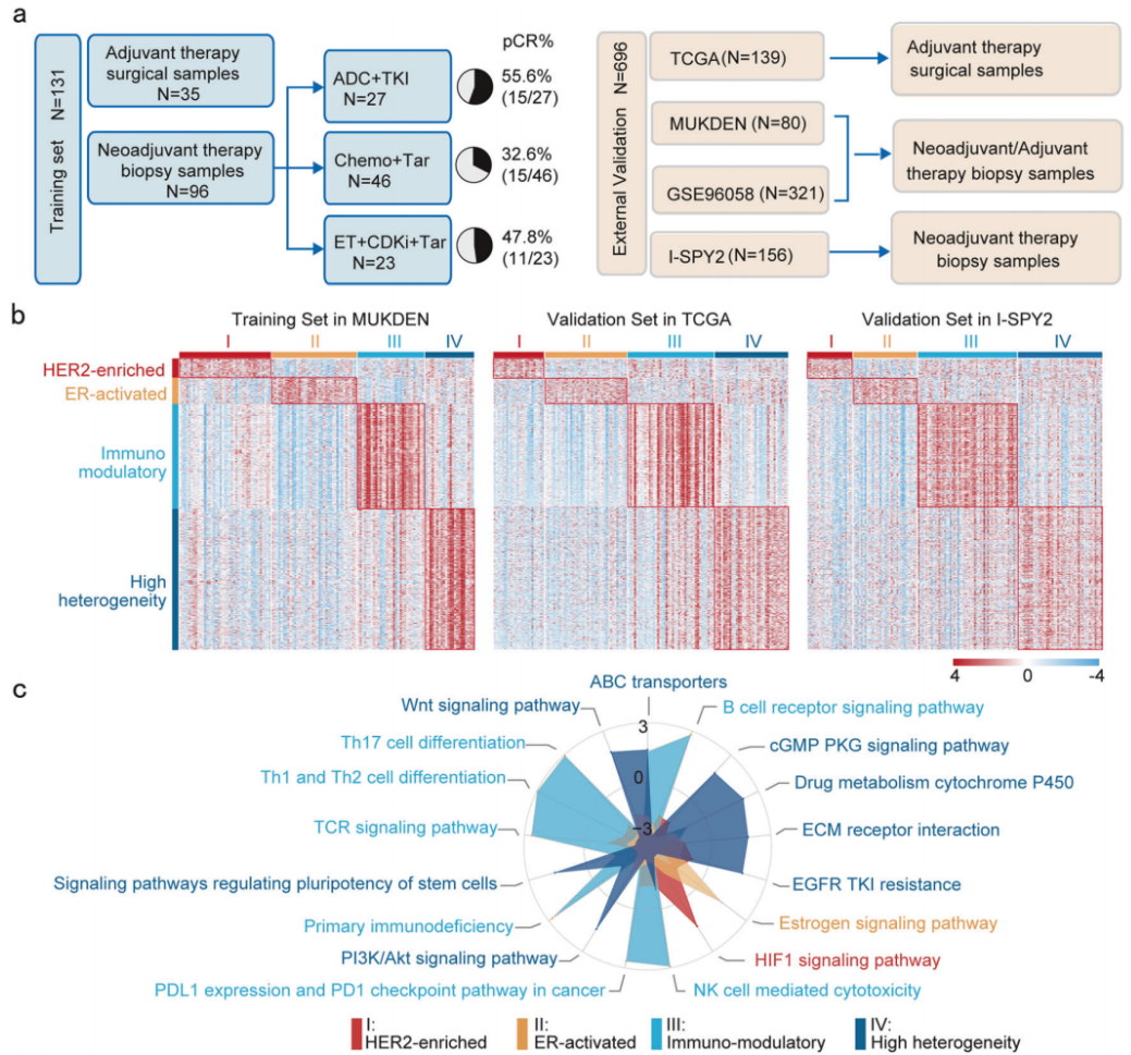 图1.HR+/HER2+乳腺癌患者转录组队列及mRNA亚型与临床特征关联。a)HR+/HER2+乳腺癌患者的转录组队列示意图;b)131个样本中4种亚型mRNA表达谱的热图,以及在TCGA和GEO验证队列中的验证热图;c)雷达图展示各亚型对应特征通路的标准化富集分数。