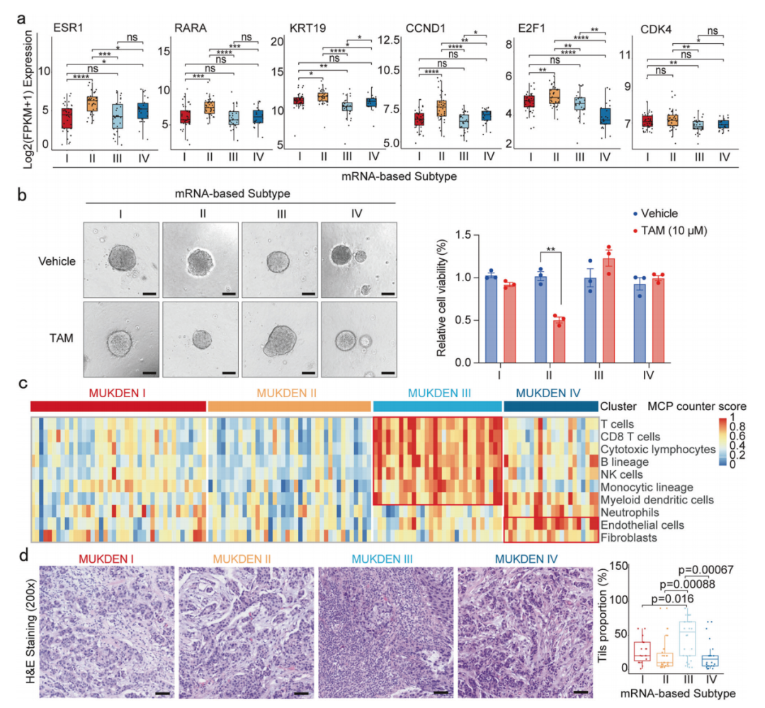 图4.MUKDEN II和III亚型的微环境景观与分子特征。a)4个亚型中ER和细胞周期信号通路相关基因表达水平的箱线图;b)他莫昔芬对不同MUKDEN亚型来源的PDOs的细胞活力检测结果;c)4个MUKDEN亚型中10种微环境细胞类型估计丰度的热图;d)4个MUKDEN亚型中的肿瘤浸润淋巴细胞水平。