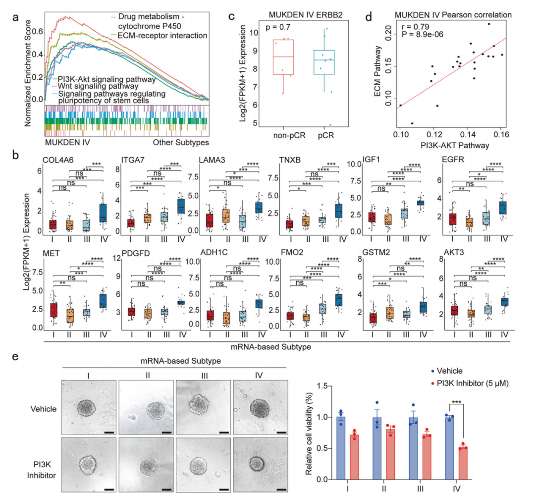 图5.MUKDEN IV亚型的高度异质性特征。a)MUKDEN IV亚型队列中主要特征信号通路的GSEA富集分析;b)4个亚型中PI3K-AKT、ECM、Wnt和EGFR信号通路相关基因表达水平的箱线图;c)MUKDEN IV亚型中pCR与非pCR患者ERBB2表达情况;d)MUKDEN IV亚型中PI3K-AKT与ECM信号通路之间的相关性;e)PI3K抑制剂对不同MUKDEN亚型来源的PDOs的细胞活力检测结果。