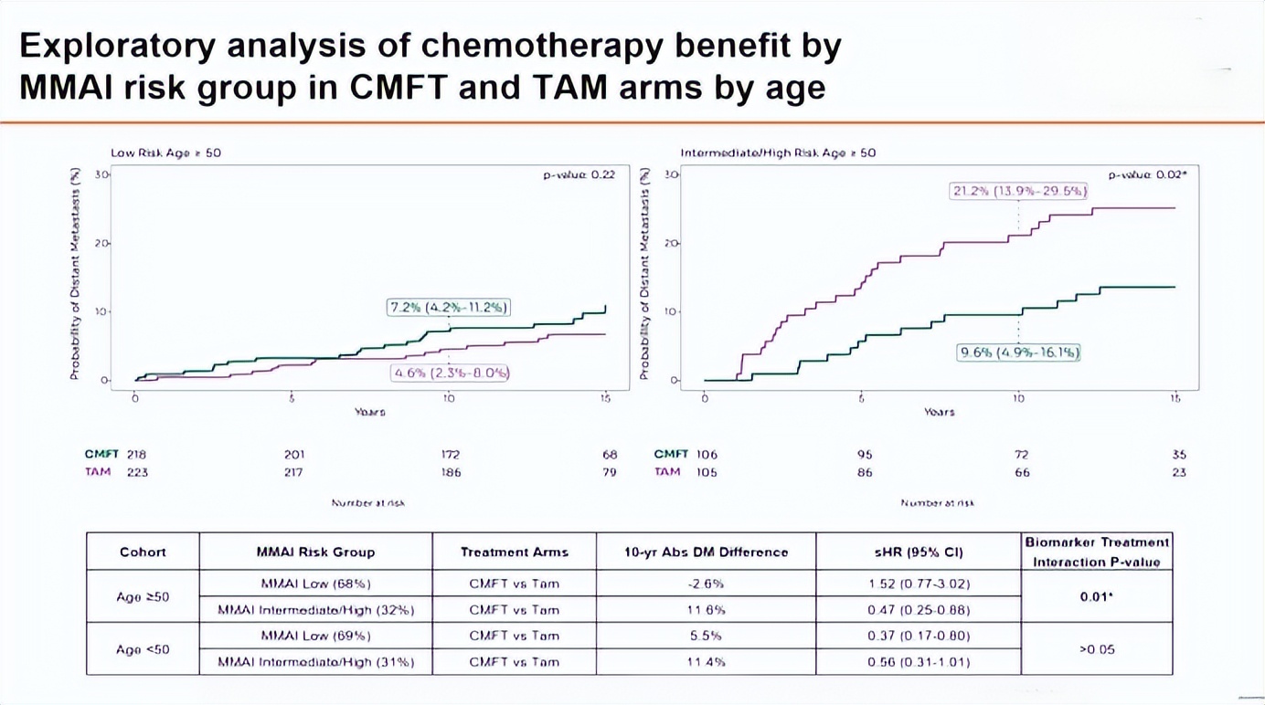 按年龄分层(≥50岁vs<50岁)分析中,交互项仅在年龄≥50岁人群中达到统计学显著(p=0.01),该人群中MMAI评分为中/高危患者占比32%,加入化疗10年DM率由21%降至10%(CMFT 10%vs TAM 21%,相对降低52%),相比之下,MMAI评分为低危患者无论是否加化疗10年DM率差异较小(CMFT 7%vs TAM 5%);在年龄<50岁人群中,MMAI评分预测性交互不显著,但化疗在低危与中/高危两类患者中均有获益。