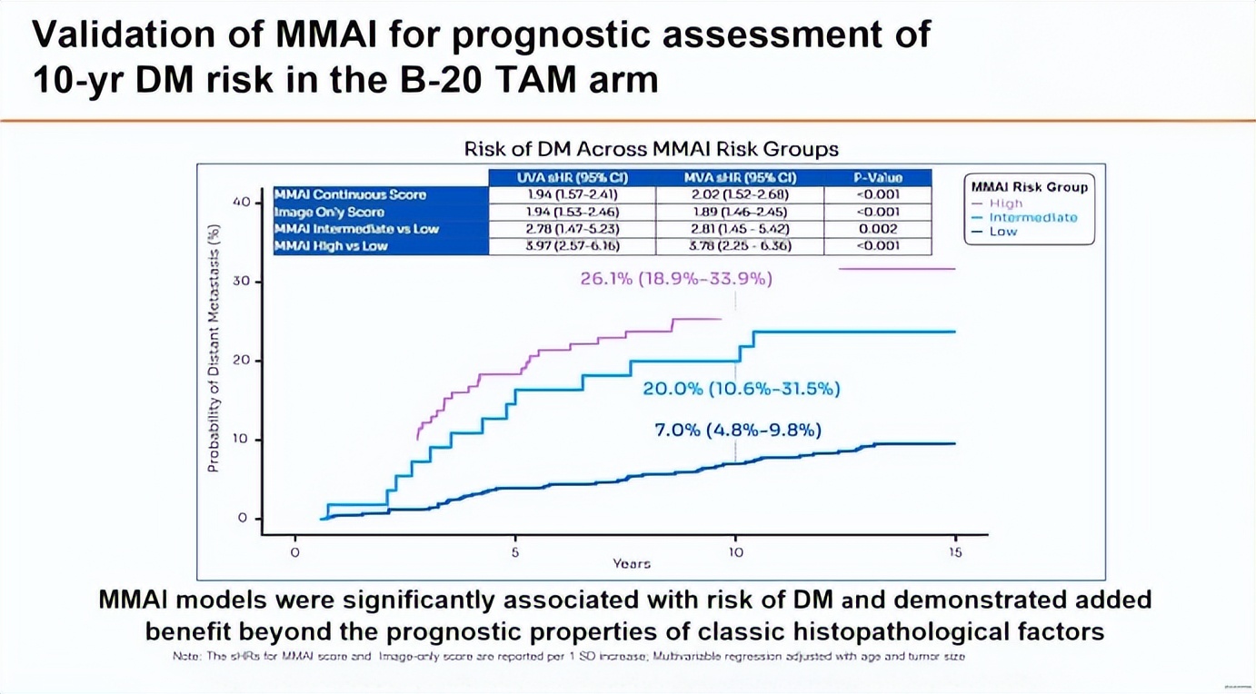 近几年,多模态人工智能(MMAI)在乳腺癌领域发展迅速,其核心理念是把常规数字病理H&E切片与基础临床信息(年龄,肿瘤大小,T/N分期等)整合,例如Artera平台在WSG PlanB、ADAPT等III期临床试验中,证实其MMAI评分在5259例HR+/HER2-早期乳腺癌患者中独立预测远处转移风险;同为计算病理学工具的RlapsRisk BC模型使用数字病理AI评分,可以显著提高ER+/HER2-早期乳腺癌患者5年无转移生存(MFS)的预后判断能力。在这样的发展背景下,本研究将MMAI模型放在我们非常熟悉、长期随访且有化疗对照的NSABP B-20试验中进行外部验证——在TAM单药臂中,无论采用连续评分还是低/中/高危风险分组,MMAI对10年DM风险的区分度都相当可观,高危组与低危组之间近4倍的sHR差异说明其预后分层能力是扎实的。