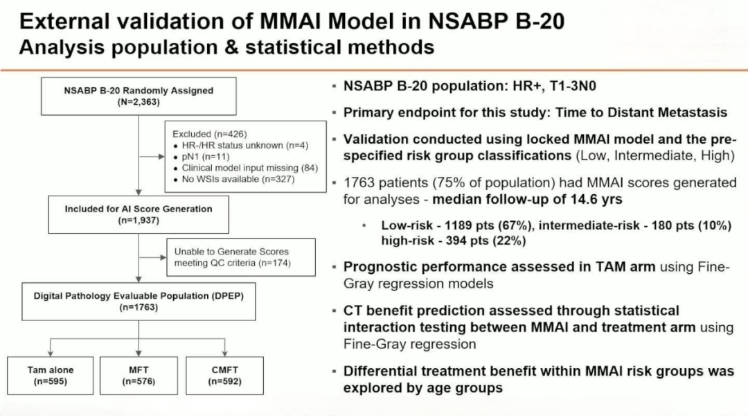 在HR+早期乳腺癌(EBC)患者中,进行远处转移(DM)的精准风险分层是制定辅助治疗决策的关键,尤其影响是否加用化疗(CT)。多模态人工智能(MMAI)已在ABCSG-08试验中证实具有预后价值,它将组织病理图像与临床数据整合进行DM风险分层,有望成为多基因检测之外的低成本补充工具。本研究基于具有里程碑意义的NSABP B-20随机III期试验(HR+且LN-早期乳腺癌),比较TAM单药与TAM联合甲氨蝶呤+氟尿嘧啶(MFT)或TAM联合环磷酰胺+甲氨蝶呤+氟尿嘧啶(CMFT),以评估MMAI算法,探索其在HR+且LN-乳腺癌辅助化疗决策中的潜在应用价值。