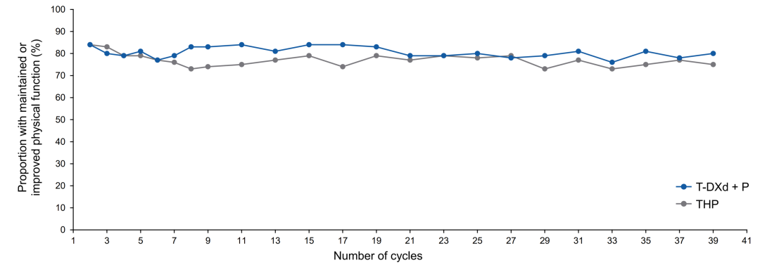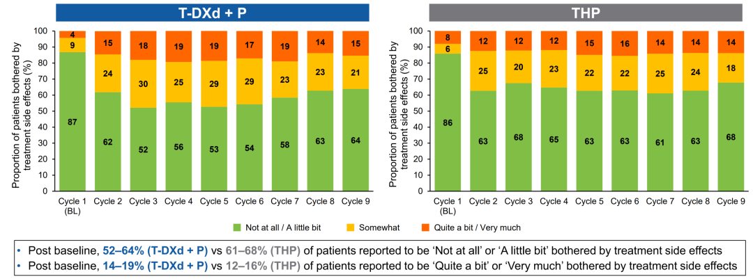 在疼痛方面,两组治疗方案出现具有临床意义恶化的风险相近,本次中期分析时两组的中位恶化时间均尚未达到。与THP方案相比,T-DXd+P方案引起的上肢症状及皮肤/黏膜症状更少,在疲劳和腹泻方面的影响程度相当,并与更多恶心/呕吐、食欲减退及便秘症状相关,这些症状可通过预防性临床管理进行控制。多数患者报告身体功能较基线维持或改善,且两组间结果一致。