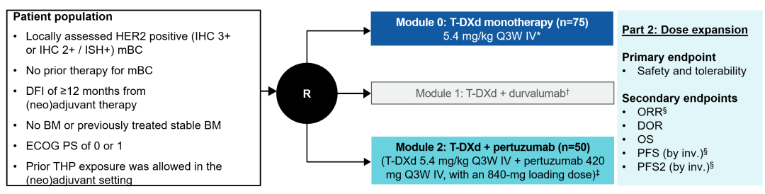 张莉莉教授:DB07研究和DB09研究共同奠定了T-DXd联合帕妥珠单抗在一线抗HER2治疗的价值。DB07研究为Ⅰb/Ⅱ期、开放标签、模块化研究[4]。入组患者需为一线治疗人群,既往未针对转移性疾病接受过全身治疗,且在(新)辅助治疗结束后无病间隔≥12个月,研究还纳入了既往经治的稳定性脑转移人群。该研究主要分为三个模块:模块0为T-DXd单药、模块1为T-DXd+度伐利尤单抗、模块2为T-DXd+帕妥珠单抗。主要终点是安全性和耐受性。次要终点涵盖了ORR、DOR、OS、研究者评估的PFS和PFS2等关键疗效指标。此次SABCS主要报告了模块0(75例)和模块2(50例)的最终结果。