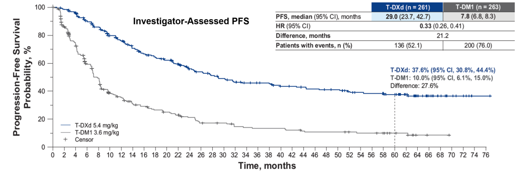 T-DXd组确认的ORR为78.9%,13%的患者达到完全缓解(CR),而T-DM1确认的ORR为36.9%,CR率为4.9%,两组中位持续缓解时间(DOR)为31.8个月vs 17.0个月。此外,在5年随访时,T-DXd较T-DM1在OS方面显示了持续的改善,mOS为56.4个月vs 42.7个月(HR 0.74,95%CI 0.59~0.94),绝对值改善超过1年;5年OS率为48.1%vs 36.9%,提示近一半患者生存超过5年,实现了长期生存。
