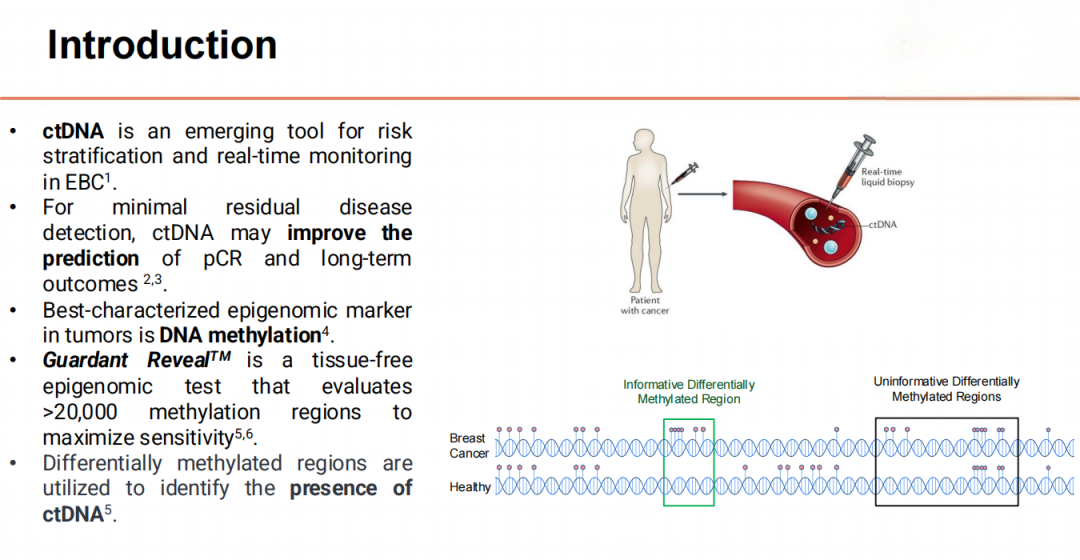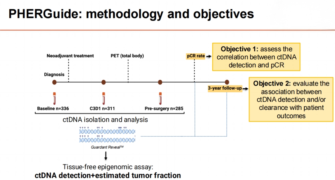 研究背景:HER2靶向治疗显著改善了HER2+早期乳腺癌(EBC)患者的预后,促使人们开始研究不同的降阶梯治疗方案。ctDNA是早期乳腺癌风险分层和实时监测的新兴工具,为个体化治疗决策提供了可能。PHERGain研究显示,对于接受曲妥珠单抗和帕妥珠单抗(HP)新辅助双HER2阻断治疗的I-IIIA期HER2+EBC患者,采用FDG-PET引导、病理完全缓解(pCR)适应的策略,可安全地省略化疗(CT)。PET和pCR引导的方法使37.9%的患者省略了化疗,在整个适应性治疗组中,3年无侵袭性疾病生存率(iDFS)达到94.8%。在PHERGuide亚研究中,我们评估了一种基于非肿瘤信息表观基因组的ctDNA检测方法在微小残留病灶检测中的应用,旨在提高pCR和3年iDFS的预测准确性,从而在PHERGain研究的框架内,为HER2+EBC患者制定更个性化的(新)辅助治疗策略。
