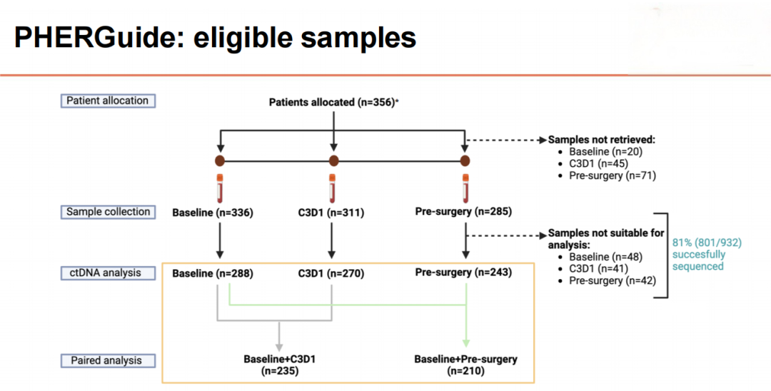 研究方法:在356例随机分组的患者中,A组(标准治疗)63例和B组(适应性治疗)267例接受了手术治疗。PHERGuide亚研究的主要目的是评估所有入组患者中,两个治疗周期后ctDNA清除与pCR(ypT0/is ypN0)之间的相关性。次要目的是评估ctDNA水平与患者预后之间的关联。分别于基线、新辅助治疗第2周期后和术前采集血样。