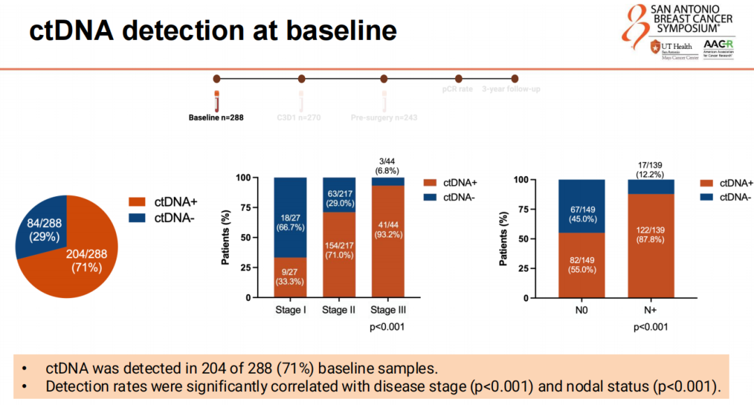 研究结果:在932份样本中,801份符合PHERGuide亚研究条件(A组161份,B组640份)。在288份适合分析的基线样本中,204份(71%)检测到ctDNA。检出率与疾病分期显著相关:I期为33.3%(9/27),II期为71%(154/217),III期为93%(41/44)(P<0.001)。在基线可检测到ctDNA的患者中,分别有126/167例(75.4%)和124/149例(83.2%)在两个治疗周期后以及术前显示ctDNA清除。