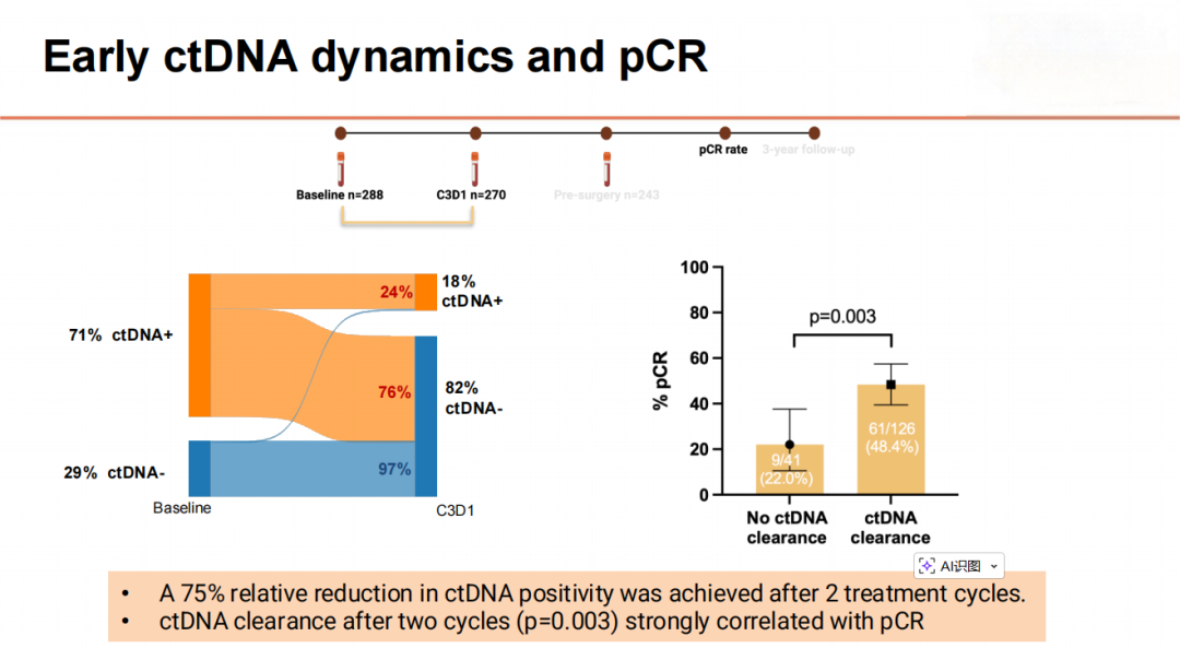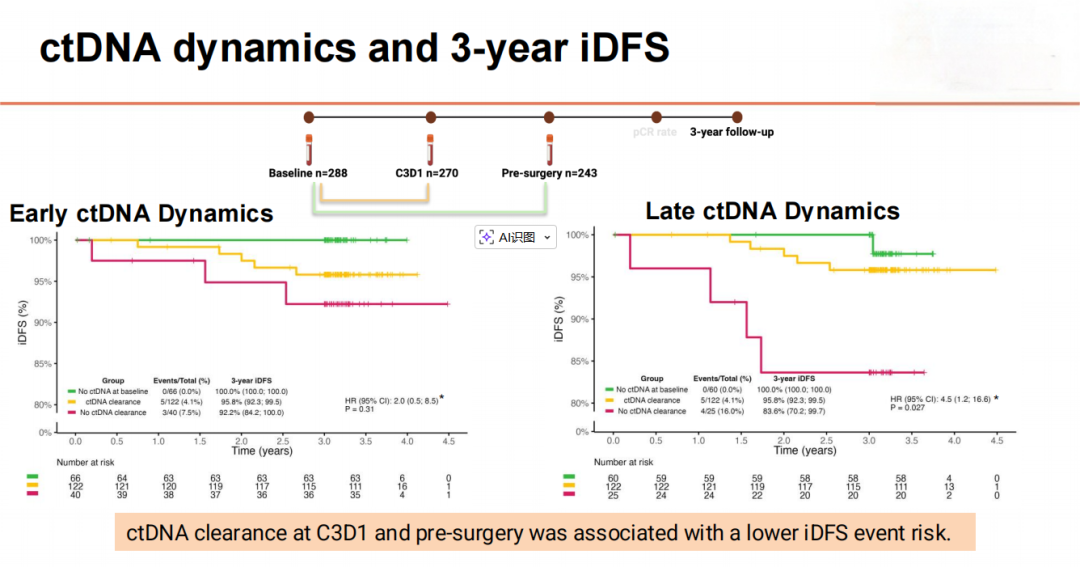两个治疗周期后的ctDNA清除(P=0.003)和术前时间点的ctDNA清除(P<0.001)与达到pCR显著相关。未观察到基线ctDNA状态与pCR之间存在显著相关性(P=0.583)。所有术前检测到ctDNA的患者(n=25)均未达到pCR。基线ctDNA阳性与较差的3年iDFS相关(92.5%vs.100%,HR 0.20;95%CI:0.02-0.98;P=0.046)。