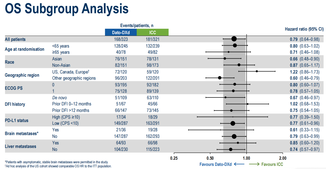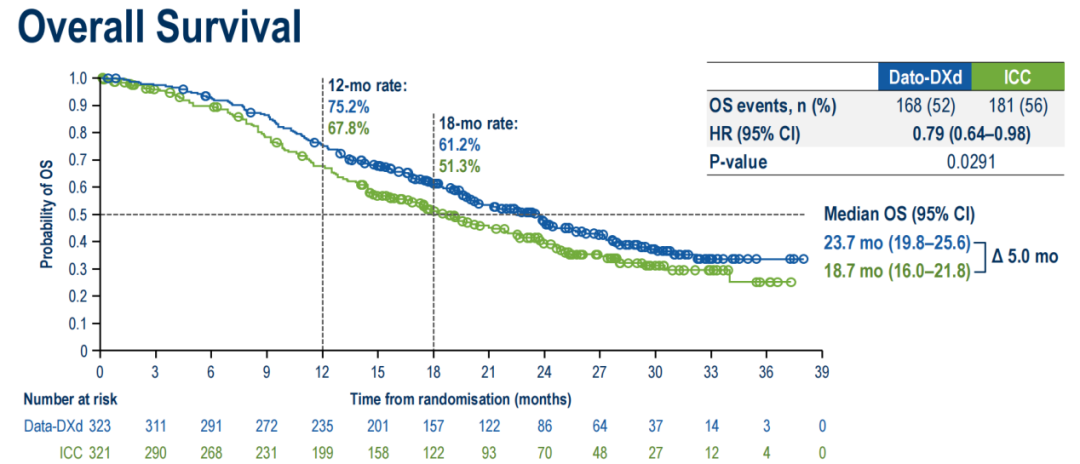 OS获益:Dato-DXd组的中位OS达到23.7个月,较化疗组(18.7个月)延长了5个月,HR为0.79(95%CI:0.64-0.98),死亡风险显著降低21%,具有显著统计学意义。
