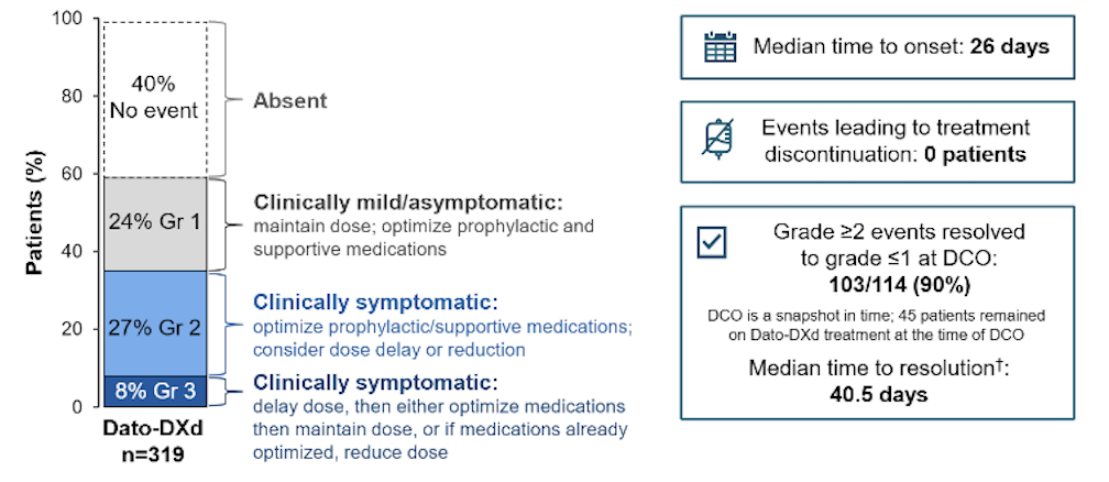 在临床关注的需特殊关注不良事件(AESIs)方面,Dato-DXd相关的口腔毒性与眼部毒性呈现出“程度轻、可逆转”的特点。