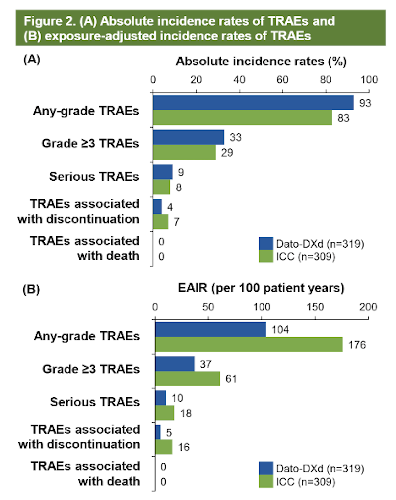 分析结果显示,Dato-DXd组与化疗组的治疗相关不良事件(TRAEs)总体发生率分别为93%和83%,≥3级TRAEs发生率分别为33%vs 29%。
