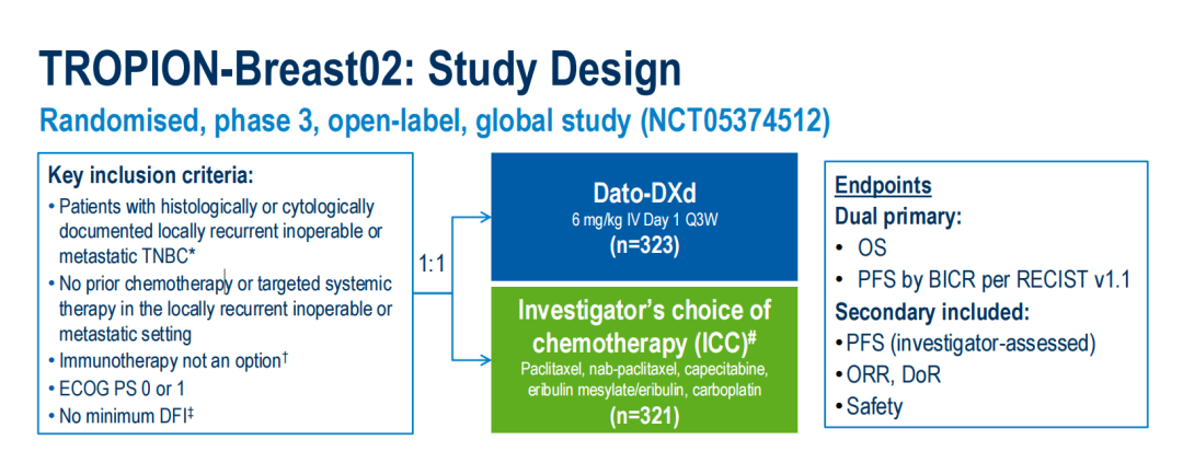 TB-02研究是一项随机、开放标签、全球多中心的III期临床研究,旨在评价Dato-DXd对比研究者选择的化疗一线治疗不适合PD-1/PD-L1抑制剂治疗的局部复发不可切除或转移性TNBC患者的疗效与安全性。