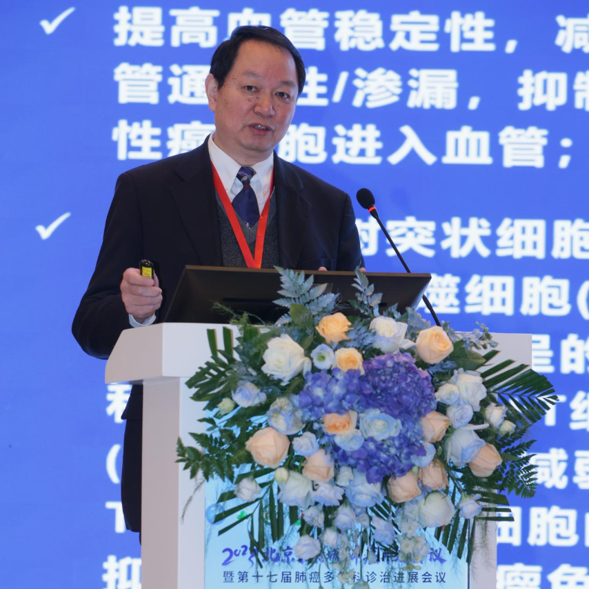 上海交通大学医学院附属胸科医院韩宝惠教授以《晚期肺癌抗血管生成治疗的问题与挑战》为题作主题报告。韩宝惠教授首先回顾了抗血管生成治疗的发展历程,系统梳理了从大分子单抗、小分子多靶点TKI到PD-(L)1/VEGF双抗等不同类别药物的演进。韩教授指出,在驱动基因阳性NSCLC中,抗血管药物与靶向治疗联合可协同增效、延缓耐药,多项探索性研究已显示出初步潜力;而在驱动基因阴性NSCLC中,通过改善肿瘤微环境,抗血管药物与免疫治疗的联合同样是重要策略,并分享了“去化疗”双药联合及维持治疗阶段联合等多种模式的近期研究数据。对于小细胞肺癌(SCLC),韩教授也介绍了抗血管联合免疫与化疗所取得的生存获益。面对疗效差异大、缺乏有效生物标志物等挑战,韩教授进一步指出,未来可探索基于临床病理、基因、新生血管及免疫特征的多模态人工智能模型,以实现抗血管治疗获益人群的精准识别。他强调,该领域需向更精准的策略发展,并积极探索与双抗、ADC等新型药物的联合,以切实改善患者预后。