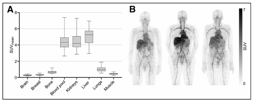 图1.[89Zr]Zr-曲妥珠单抗在不同组织中的生理性摄取。(A)各正常组织中[89Zr]Zr-曲妥珠单抗的SUVmean±SD(每组n=12-15)。(B)3名患者在给药后5-7天的代表性全身[89Zr]Zr-曲妥珠单抗PET最大强度投影图像,显示示踪剂在不同器官中的异质性积累。