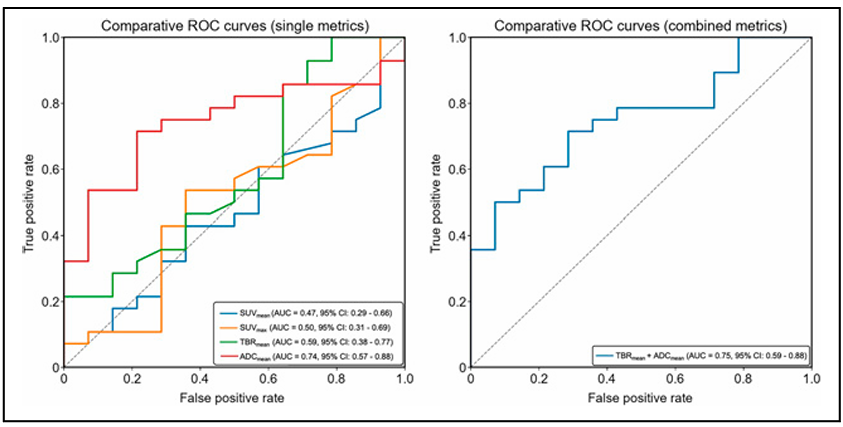 通过逻辑回归分析,研究比较了各影像学指标预测治疗反应的能力。结果显示,DW-MRI衍生的平均ADC值表现出最佳的预测效能,曲线下面积达0.74。相比之下,PET衍生的SUV指标预测价值有限,平均SUV和最大SUV的曲线下面积分别仅为0.47和0.50。即使使用经过标准化的肿瘤背景比值,也仅带来有限的改善。当将肿瘤背景比值与平均ADC结合时,曲线下面积有小幅提升至0.75,但其置信区间与单独使用平均ADC存在重叠,说明这种组合并未带来统计显著的改善。