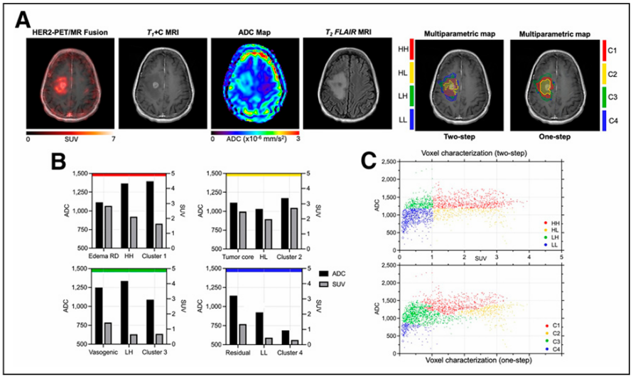 图6.使用[89Zr]Zr-曲妥珠单抗PET/ADC对乳腺癌脑转移进行定量多参数评估,并与生理栖息地比较:弥散受限水肿区、肿瘤增强核心区、血管源性水肿区和残留区。(A)显示脑病灶的代表性横断面[89Zr]Zr-曲妥珠单抗PET、解剖T1加权、ADC和T2/FLAIR图像,并叠加了使用ADC和SUV值中位数分离(两步法)和聚类(一步法)的多参数图谱。(B)SUVmean和ADC的柱状图显示一步法、两步法和生理区域之间的区分度更好。