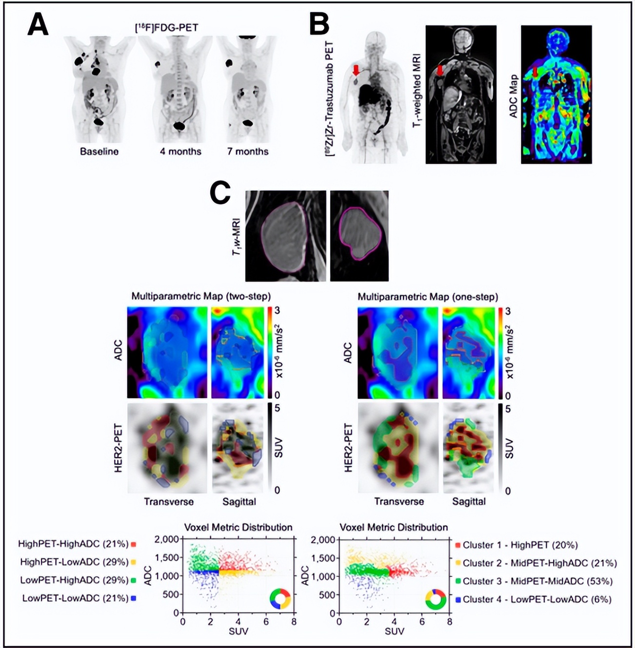 图5.(A)代表性纵向[18F]FDG PET最大强度投影扫描显示肿瘤负荷先减少后进展。(B)代表性[89Zr]Zr-曲妥珠单抗PET/MRI图像。(C)两种多参数评估技术,轮廓线标示体素分类。基于中位数的阈值法(两步法)显示基于指标强度的区域分布均匀,空间连贯性有限;相比之下,聚类法(一步法)识别出独特的瘤内簇,反映在体素指标分布上。