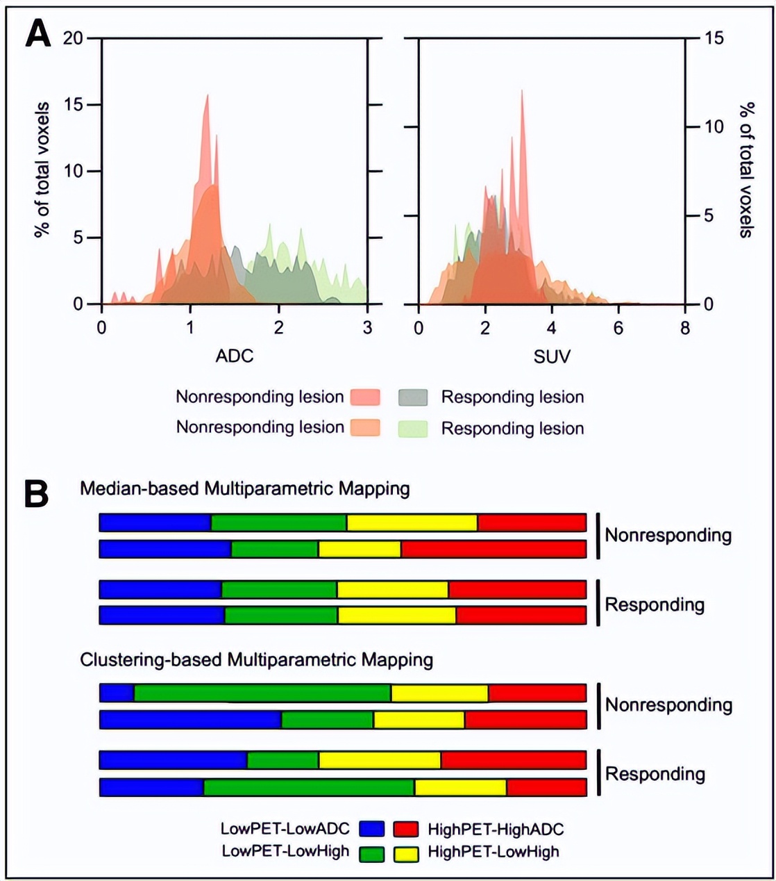 图7.大转移病灶的定性分析揭示了ADC和SUV分布的不同模式。(A)应答肿瘤中的SUV更均质。(B和C)无应答病灶显示ADC分布均质且偏向较低值,表明细胞密度增加,而应答病灶的ADC分布更异质。