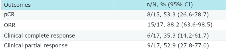病理完全缓解率(pCR):pCR是预测长期生存获益的重要指标,在15名接受了手术的患者中,pCR率达到53.3%。这意味着超过一半的患者在手术后,其乳腺原发灶和腋窝淋巴结中均找不到任何残留的浸润癌细胞。