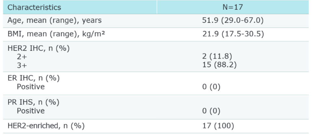 截至2025年6月25日,共17例患者可评估,中位随访时间5.2个月(范围1.9-8.5个月)。所有患者均为女性,平均年龄51.9岁(范围29.0-67.0岁),平均BMI 21.8 kg/m²(范围17.5-30.5)。