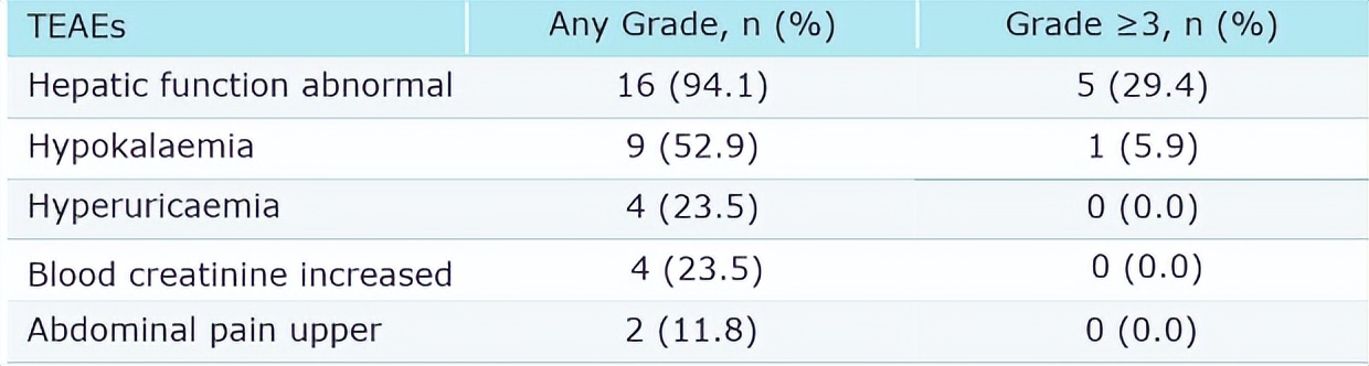最常见的不良反应是肝功能异常(94.1%),其中29.4%为3级或以上(需医疗干预)。但中位持续时间为13天,且没有患者因不良反应而停止治疗。其他常见不良反应包括低钾血症、血肌酐升高等。