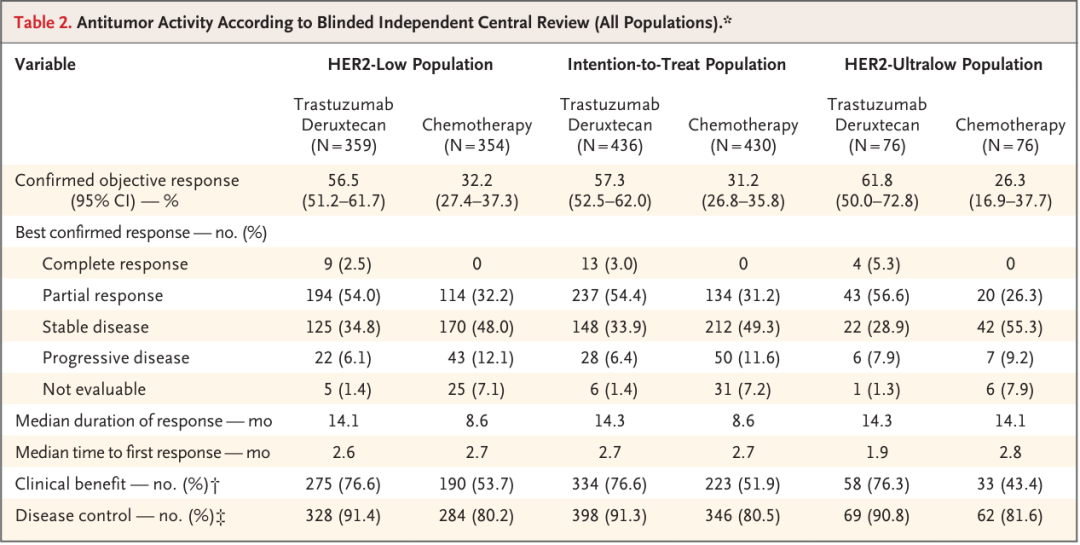 在疗效深度与持久性上,T-DXd同样表现优异:HER2低表达人群的客观缓解率(ORR)为56.5%,远超化疗组的32.2%,其中2.5%的患者实现完全缓解(CR),而化疗组无CR病例;中位缓解持续时间(DoR)为14.1个月,较化疗组的8.6个月延长64%。