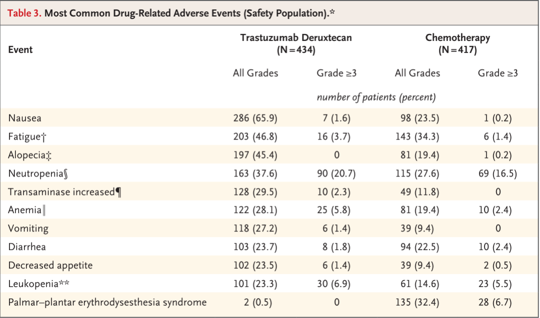 T-DXd的主要不良反应为恶心(65.9%,≥3级仅1.6%)、疲劳(46.8%)等1-2级可管理症状,而化疗组则以手足综合征(32.4%,≥3级6.7%)、中性粒细胞减少(27.6%,≥3级16.5%)为主,对生活质量干扰更大。此外,T-DXd相关间质肺病(ILD)发生率为11.3%,98%为1-2级,经规范监测与干预可有效管控,心脏安全性也表现良好,无心力衰竭病例报告。