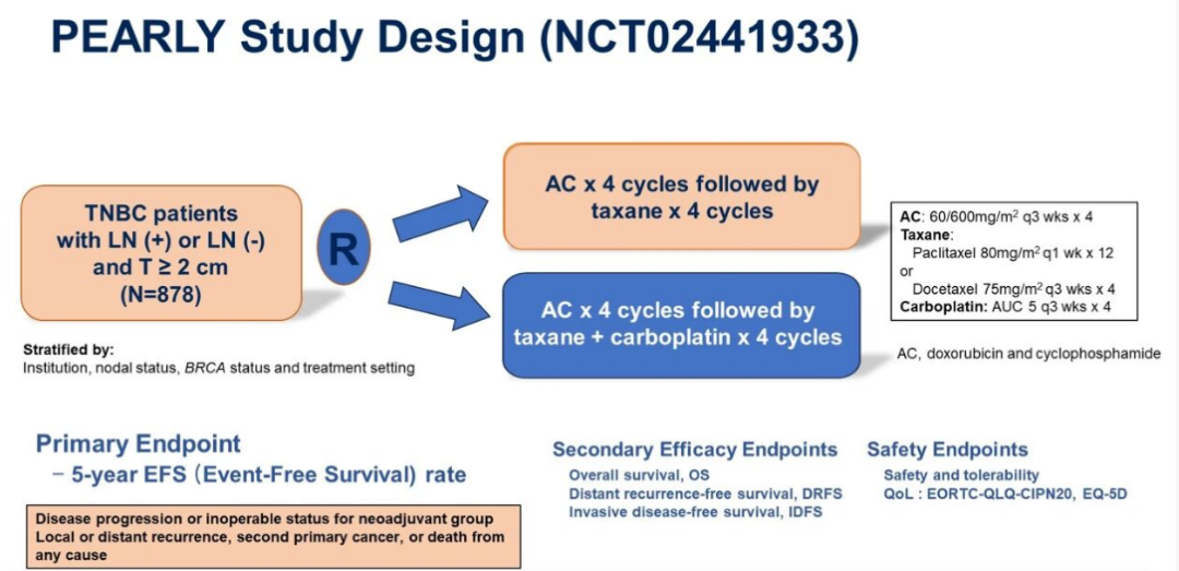 在去年的ASCO大会上,韩国研究者发起PEARLY研究结果也显示,在标准蒽环类药物和紫杉醇类药物治疗基础上加用卡铂可显著改善早期TNBC患者的EFS。