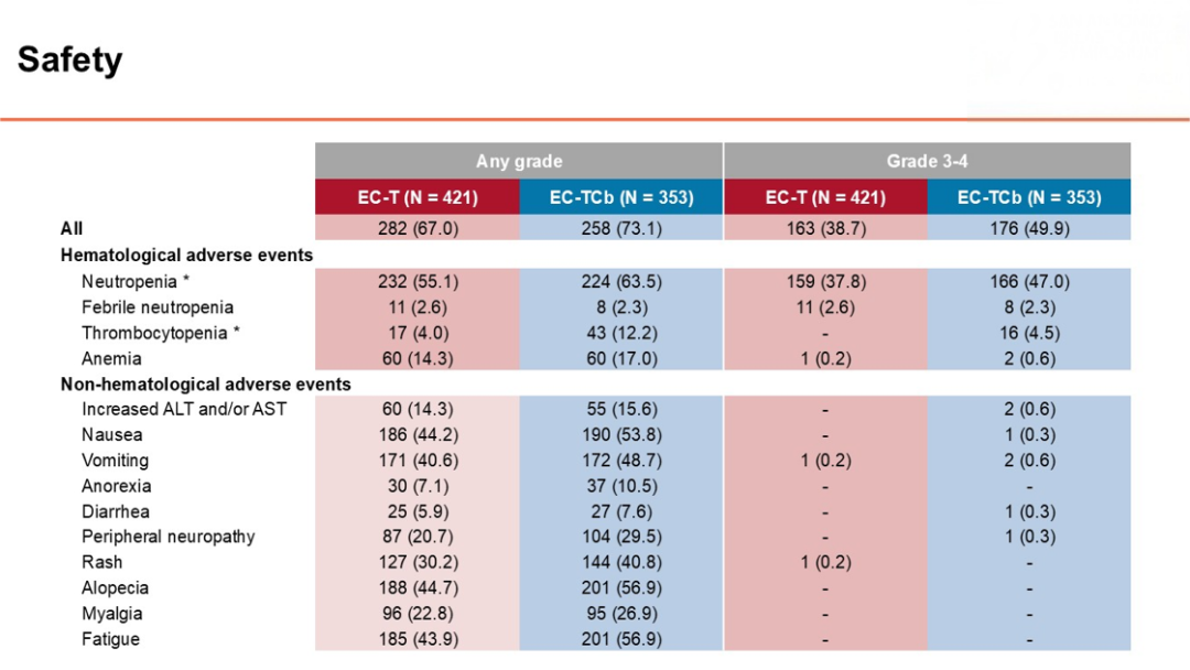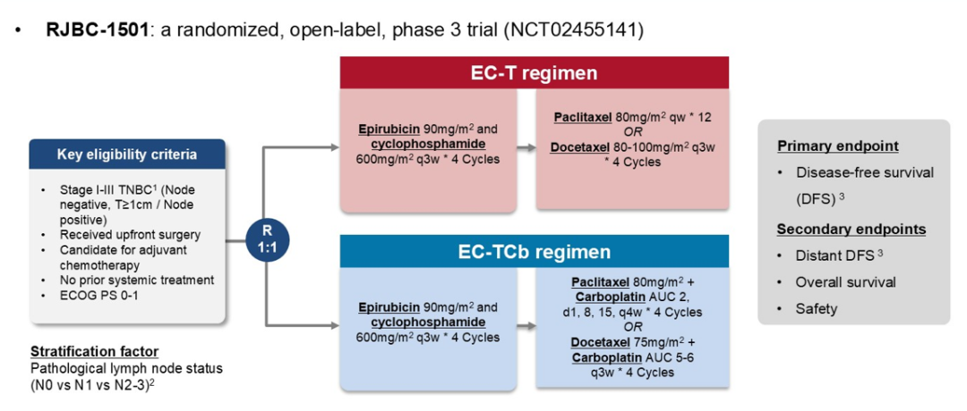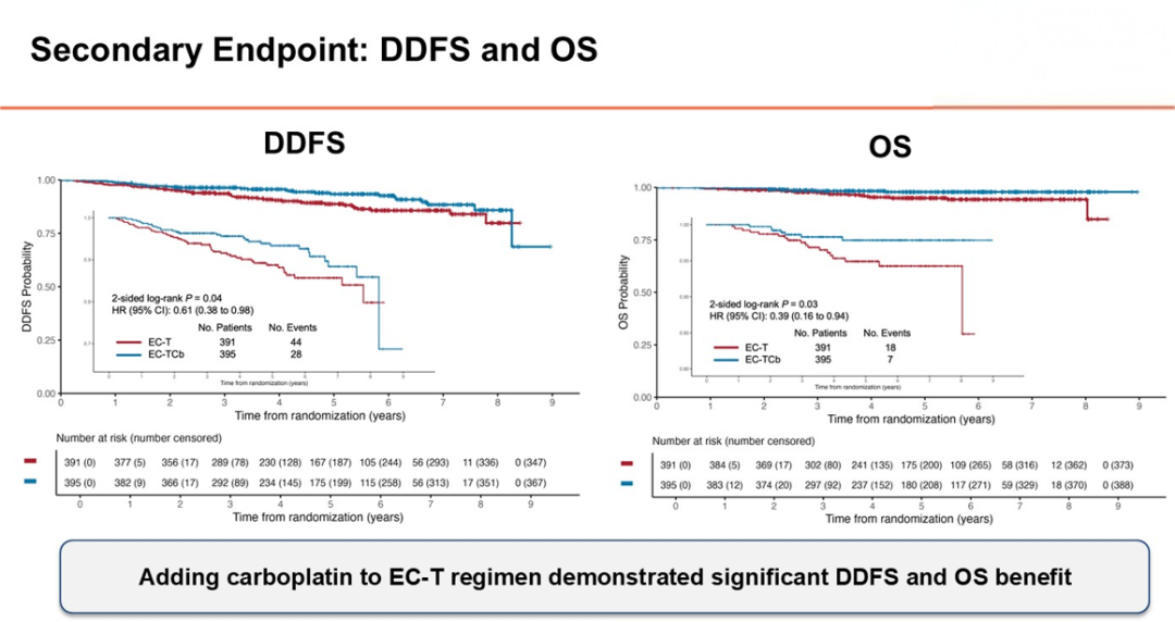 研究共纳入786例已接受根治性手术(保乳或全乳切除)、淋巴结阳性或淋巴结阴性但肿瘤直径≥1.0cm的早期三阴性乳腺癌患者,按1:1随机分为EC-T组或EC-TCb组。主要终点为意向治疗人群(ITT)的DFS,次要终点包括DDFS、OS和安全性。
