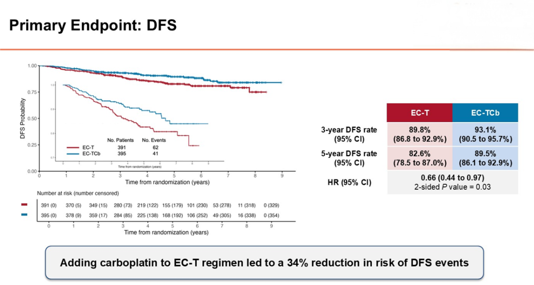 截至2025年3月1日,中位随访时间为4.52年。结果显示,加入卡铂显著改善患者DFS,风险比为0.66,意味着疾病复发或死亡风险降低34%。EC-T组与EC-TCb组的3年DFS率分别为89.8%和93.1%,5年DFS率分别为82.6%和89.5%,DFS生存曲线在随访期间持续分离。亚组分析显示一致获益趋势。