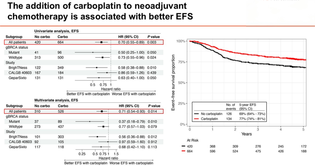 综上所述,这项对三项II期新辅助研究的汇总分析表明:在总体人群中,加用卡铂能显著提高pCR率并改善EFS;在pCR方面,获益主要驱动于无BRCA突变的人群;对于BRCA突变患者,pCR率无显著提升。在EFS方面,无论BRCA突变状态如何,所有患者均能从卡铂中持续获益。