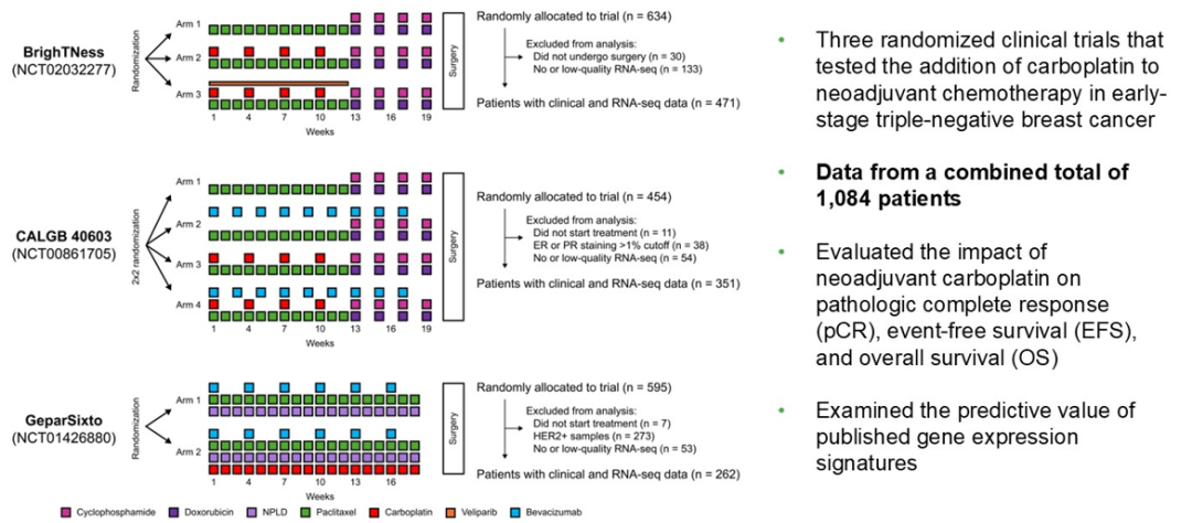 接下来我将介绍的三项研究均与铂类药物在乳腺癌治疗中的应用相关。其中第一项研究尤为值得关注,它整合了既往三项评估新辅助化疗中加入卡铂的随机临床试验,进行了一项汇总分析。该研究(摘要号:RF2-02)纳入了BrighTNess(NCT02032277,n=471)、CALGB 40603(NCT00861705,n=351)和GeparSixto(NCT01426880,n=262)三项试验的数据,评估了卡铂对pCR率、无事件生存期(EFS)和OS的影响,并探讨了胚系BRCA1/2突变状态作为潜在生物标志物的价值。