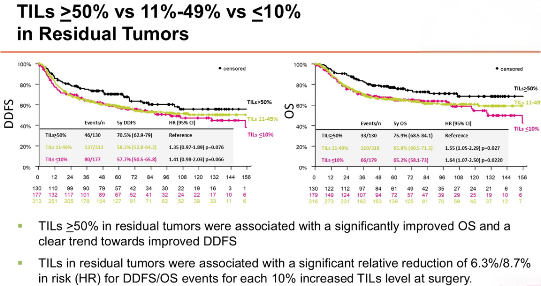 相反,在残余肿瘤中,肿瘤浸润淋巴细胞(TILs)每增加10%,患者的DDFS和OS风险分别显著降低6.3%与8.7%。此外,TILs高表达(≥50%)的患者预后明显优于TILs低表达的患者,该趋势在OS分析中也得到一致呈现。