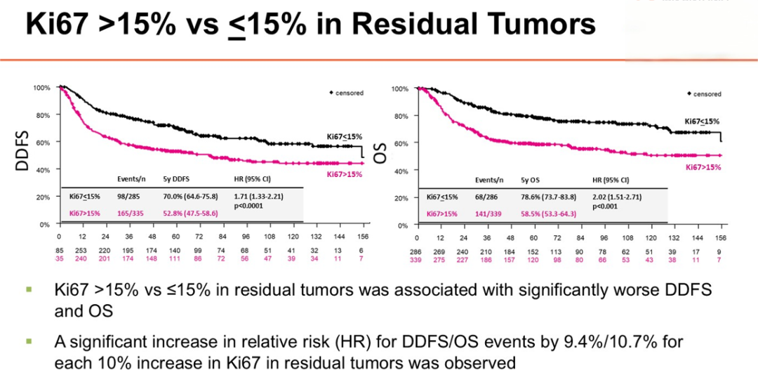 预后分析显示,残余肿瘤中Ki67>15%与较差的DDFS(HR 1.71)和OS(HR 2.02)显著相关。Ki67每增加10%,DDFS和OS事件风险分别增加9.4%和10.7%。由此可见,在新辅助化疗之后的三阴性乳癌残留肿瘤中,Ki67的表达是可以明显的去预示患者预后的。