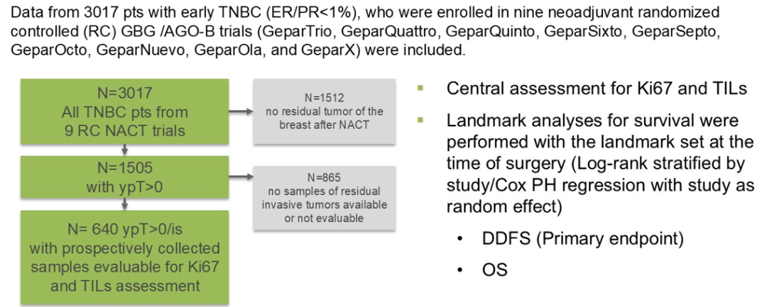 三阴性乳腺癌(TNBC)患者接受新辅助化疗(NACT)后,若存在残留浸润性病灶,通常与高复发率和较差的总生存期(OS)相关。在早期乳腺癌中,pCR与非pCR的评估与OS的关联并不一致。GBG/AGO-B研究(摘要号:RF2-01)旨在探索新辅助治疗后残余肿瘤(RT)中的增殖指标(Ki67)和肿瘤浸润淋巴细胞(TILs)水平,以更精确地预测患者预后。该研究纳入了九项GBG/AGO-B临床试验(GeparTrio、GeparQuattro、GeparQuinto、GeparSixto、GeparSepto、GeparOcto、GeparNuevo、GeparOla和GeparX)中接受含蒽环类/紫杉类方案新辅助化疗的TNBC患者。在登记的3017例患者中,1505例术后存在残余病灶(ypT>0/is,即未达pCR),其中640例拥有前瞻性收集的残余肿瘤样本,可供评估TILs和Ki67。研究主要终点为无远处转移生存期(DDFS),次要终点为OS,均采用地标分析法进行分析。