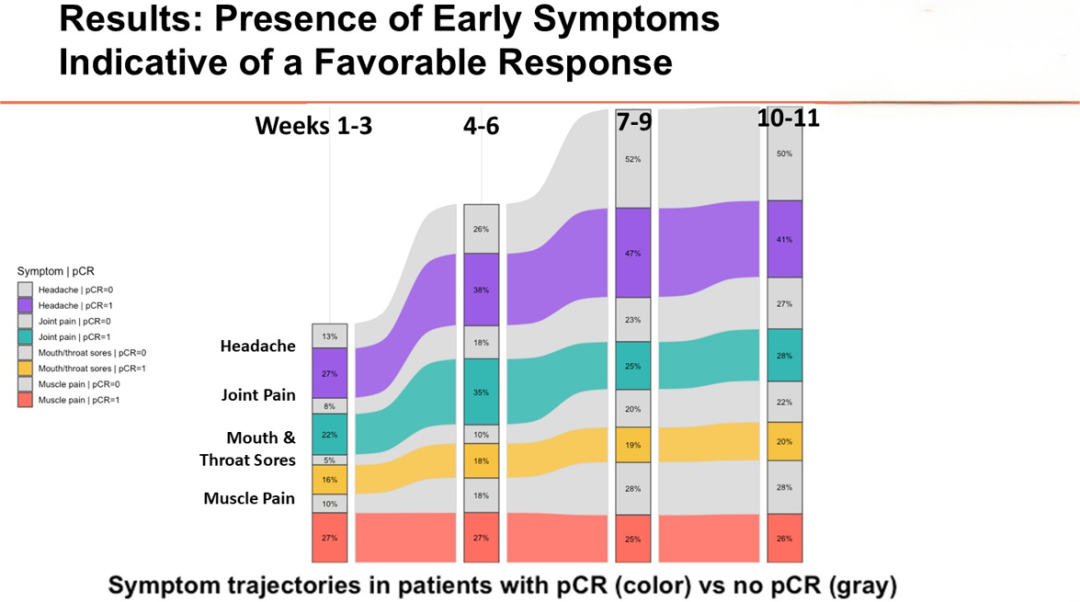 所以,从某种程度上看,治疗初期出现的这些症状可能与机体因治疗引发的免疫反应有关,因此它们与整体疗效确实存在一定的相关性。值得注意的是,本研究进一步显示:第1-3周出现的症状与pCR率具有较明显的相关性,但到第10-11周时,这种相关性显著减弱。这说明早期症状与治疗疗效有关,而晚期症状的相关性则不太明显。