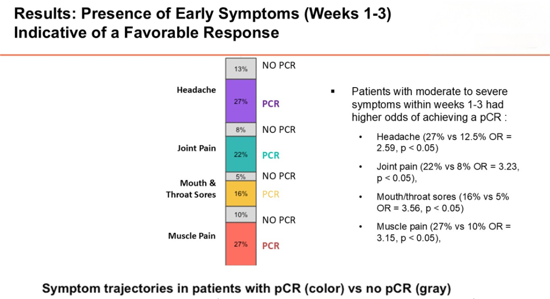 研究结果显示,在治疗第1-3周出现中度至重度症状的患者,获得pCR的几率更高(出现症状患者与正常患者pCR对比如下):