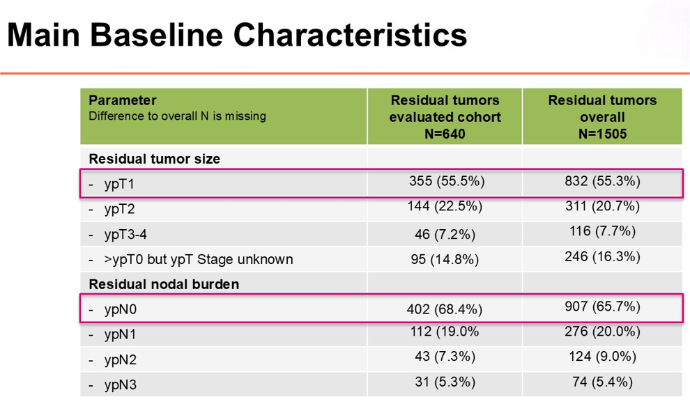 在640例可评估患者中,大多数为cT2期(57.6%),36.9%为淋巴结阳性(cN+),61.6%为II期。基线时,93.4%的肿瘤Ki67>15%(中位数51%),TILs中位数为20%。治疗后,残余肿瘤中Ki67>15%的比例降至54%(中位数18%),较基线的中位绝对变化为-27.5%。残余肿瘤中TILs中位数则增至20%,较基线增加了5%。与病灶较大(>ypT1)或淋巴结阳性(ypN+)的患者相比,达到ypT1/ypN0状态(病灶较小且淋巴结阴性)的患者,其残余肿瘤中Ki67更低、TILs更高,但这些指标与ypN状态无直接相关性。