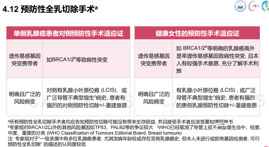 因此,新版小红书对预防性乳房切除手术提出了更为严格的要求。我们将预防性手术分为两类:一类是一侧已患乳腺癌的患者对侧健康乳房的预防性切除;另一类则是健康女性的预防性手术切除。无论哪一类,均需明确以下两点:第一,患者必须携带遗传易感基因,如BRCA1/2等致病性突变;第二,存在明确且广泛的风险病变,如小叶原位癌(LCIS)或广泛的导管重度不典型增生,且患者有强烈的手术意愿,也可考虑预防性切除——这一点在以往NCCN指南中已有体现。