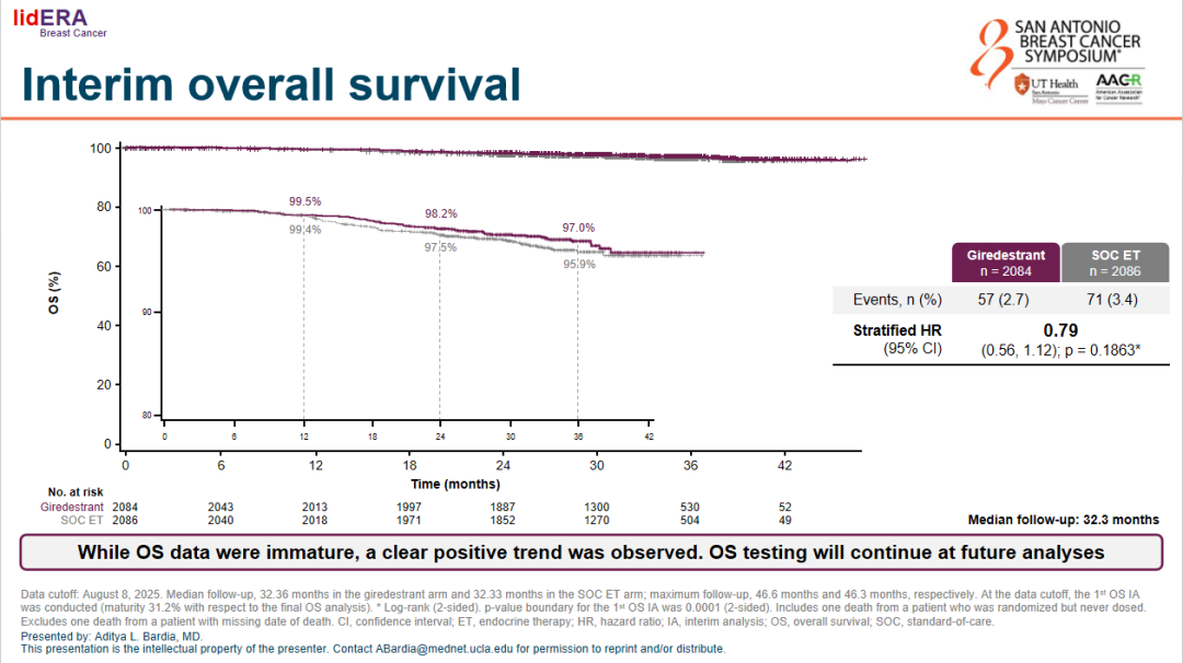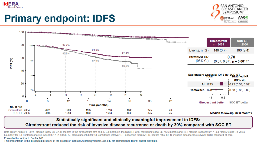 自21世纪初芳香化酶抑制剂获批以来,lidERA乳腺癌研究是首个在早期乳腺癌(eBC)中证明一种新型内分泌治疗能带来获益的试验。中位随访32.3个月时,lidERA试验表明,在ER阳性、HER2阴性、Ⅰ-Ⅲ期早期乳腺癌患者中,一线使用Giredestrant相比标准内分泌治疗,取得了具有统计学显著性和临床意义的改善。iDFS风险比:0.70(95%CI:0.57,0.87;P=0.0014);3年iDFS率:92.4%对比89.6%。总生存期呈现有利于Giredestrant组的趋势。与标准内分泌治疗相比,无远处复发生存期(DRFI)得到改善,发生远处转移性疾病的风险降低了31%。安全性特征良好,与已知特性一致。Giredestrant组的治疗中止率低于标准内分泌治疗组。总体而言,该结果支持Giredestrant成为HR+/HER2-早期乳腺癌患者潜在的新标准治疗选择。