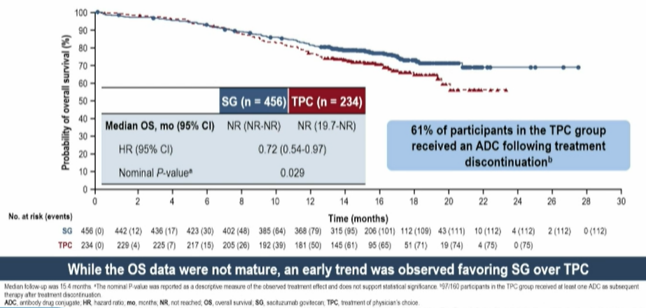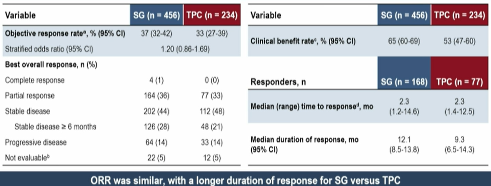 次要终点方面,研究OS数据尚未成熟(成熟度为27%),但已观察到SG组OS有早期改善趋势(HR=0.72;95%CI:0.54-0.97;P=0.029)。此外,BICR评估的ORR在SG组(37%)和TPC组(33%)中相似,但BICR评估的中位DoR在SG组中更长(分别为12.1个月vs 9.3个月)。