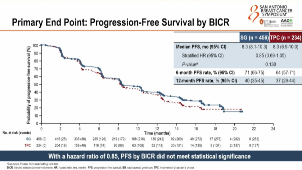 主要终点方面,结果显示,在中位随访15.4个月后,SG组及TPC组的中位PFS均为8.3个月(SG组95%CI:8.1-10.3,TPC组95%CI:6.9-10.0),与TPC组相比,SG组在BICR评估的PFS上未显示出统计学上的显著改善(风险比<hr/>=0.85,95%CI:0.69-1.05;P=0.130)。进一步分析显示,SG组和TPC组患者6个月PFS率分别为71%和64%,12个月PFS率分别为40%和37%(95%CI:29%-44%),尽管在数值上略优于TPC组,但未表现出显著差异。值得注意的是,研究者评估的PFS结果显示,SG组相较于TPC组有PFS改善(HR=0.78;95%CI:0.64-0.93;P=0.008)。