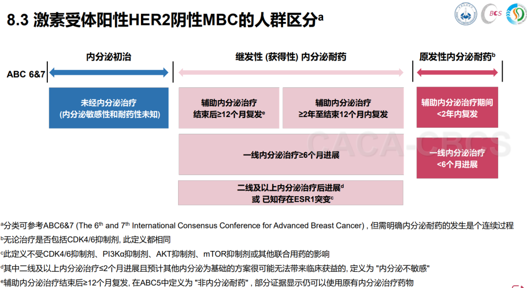 因此在本次新版小红书更新中,我们参考ABC6/7相应分类,将接受辅助内分泌治疗的继发性内分泌耐药患者分为两部分,一部分是辅助内分泌治疗≥2年至所有内分泌治疗结束1年内复发的患者,另一部分是辅助内分泌治疗结束后≥1年复发的患者;而其它继发性内分泌耐药的定义不变,仍包括一线内分泌治疗≥6个月进展患者、二线及以上内分泌治疗后进展患者和已知存在ESR1突变的患者,原发性内分泌耐药的定义在本次更新中也未改变。