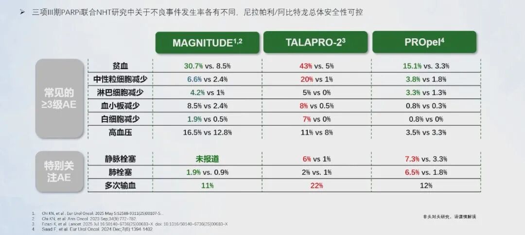 目前,针对mCRPC一线治疗,已有三项重磅III期临床研究奠定了PARP抑制剂联合新型内分泌药物(NHT)的治疗地位,分别是MAGNITUDE研究(尼拉帕利联合阿比特龙)、PROpel研究(奥拉帕利联合阿比特龙)以及TALAPRO-2研究(他拉唑帕利联合恩扎卢胺)。王晶晶教授对这三项研究的入组标准进行了细致的横向对比分析。