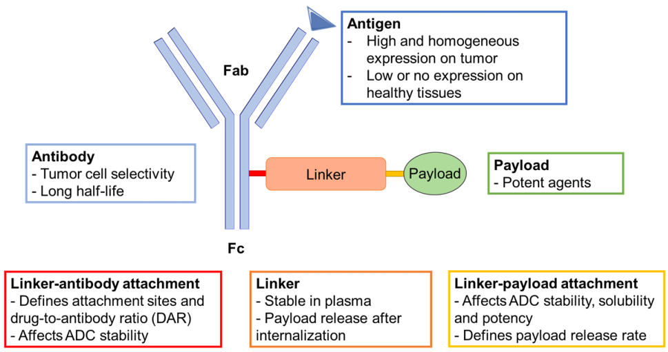 图1.抗体–药物偶联物的设计及推荐的生物学特性。详细说明了抗原、抗体、连接子–抗体结合、连接子、连接子–药物结合及药物的特性。抗体的Fc部分与半衰期和免疫原性相关。Fab部分则控制其对靶抗原的亲和力和多价性[5]。