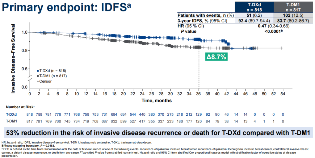 DB-05研究则针对HER2+乳腺癌新辅助治疗的患者,旨在评估T-DXd与T-DM1在高危HER2阳性早期接受新辅助治疗后仍有残留浸润病灶的患者辅助治疗中的疗效与安全性。通过T-DXd与T-DM1的头对头比较,也显示出显著的阳性结果。