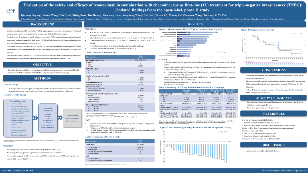 欧阳取长教授:这是一项开放标签、多中心的Ⅱ期研究[1],旨在评估PD-1/VEGF双特异性抗体依沃西单抗联合化疗在局部晚期不可切除或转移性TNBC中的安全性和疗效。该研究为依沃西单抗提供了高质量的本土循证证据,凸显了其在以下几个方面的显著优势: