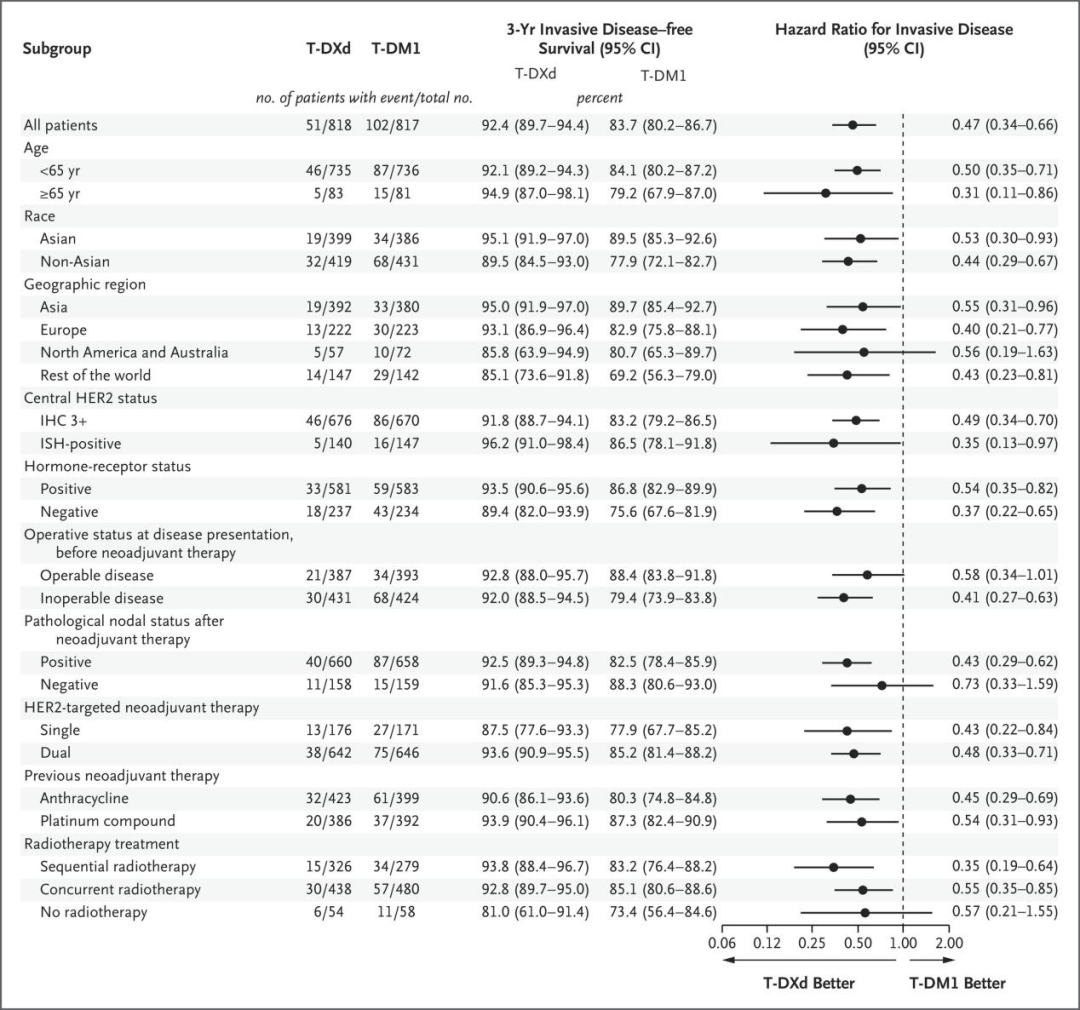 IDFS数据亚组分析显示,T-DXd治疗的IDFS获益在所有预设亚组中均保持一致,包括既往T-DM1强化辅助治疗获益有限[2]的新辅助治疗后腋窝淋巴结阳性(HR 0.43)、初始不可手术(HR 0.41)等关键亚组,且T-DXd组局部和远处复发均更少,治疗也已有减少脑转移(HR 0.64,95%CI:0.35-1.17)的初步获益趋势。